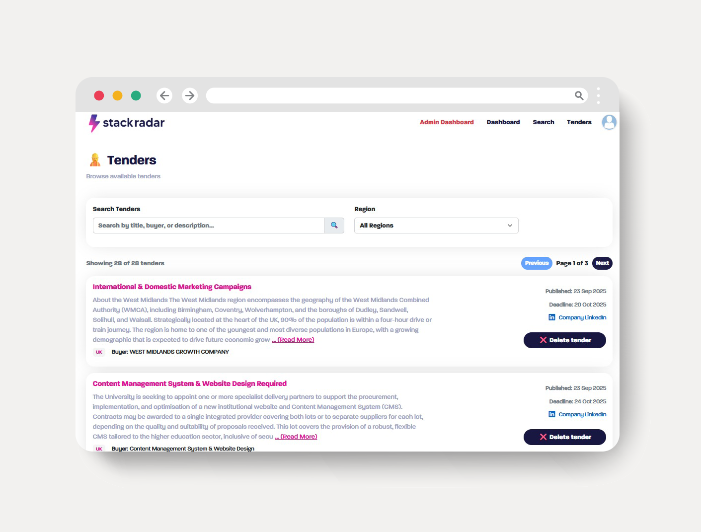“Our new business team doesn’t waste time anymore. We just monitor Stack Radar’s live tender feed and have fresh opportunities to pitch every month.”