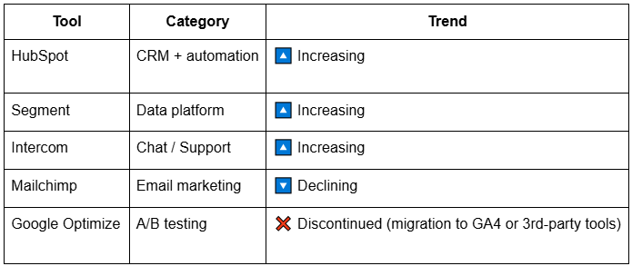 Discover the real martech trends of 2025 — based on data from over 1 million websites. We reveal which tools are truly gaining traction, which are being dropped, and how AI is reshaping the marketing stack. Stop guessing. Start tracking real adoption signals with Stack Radar.